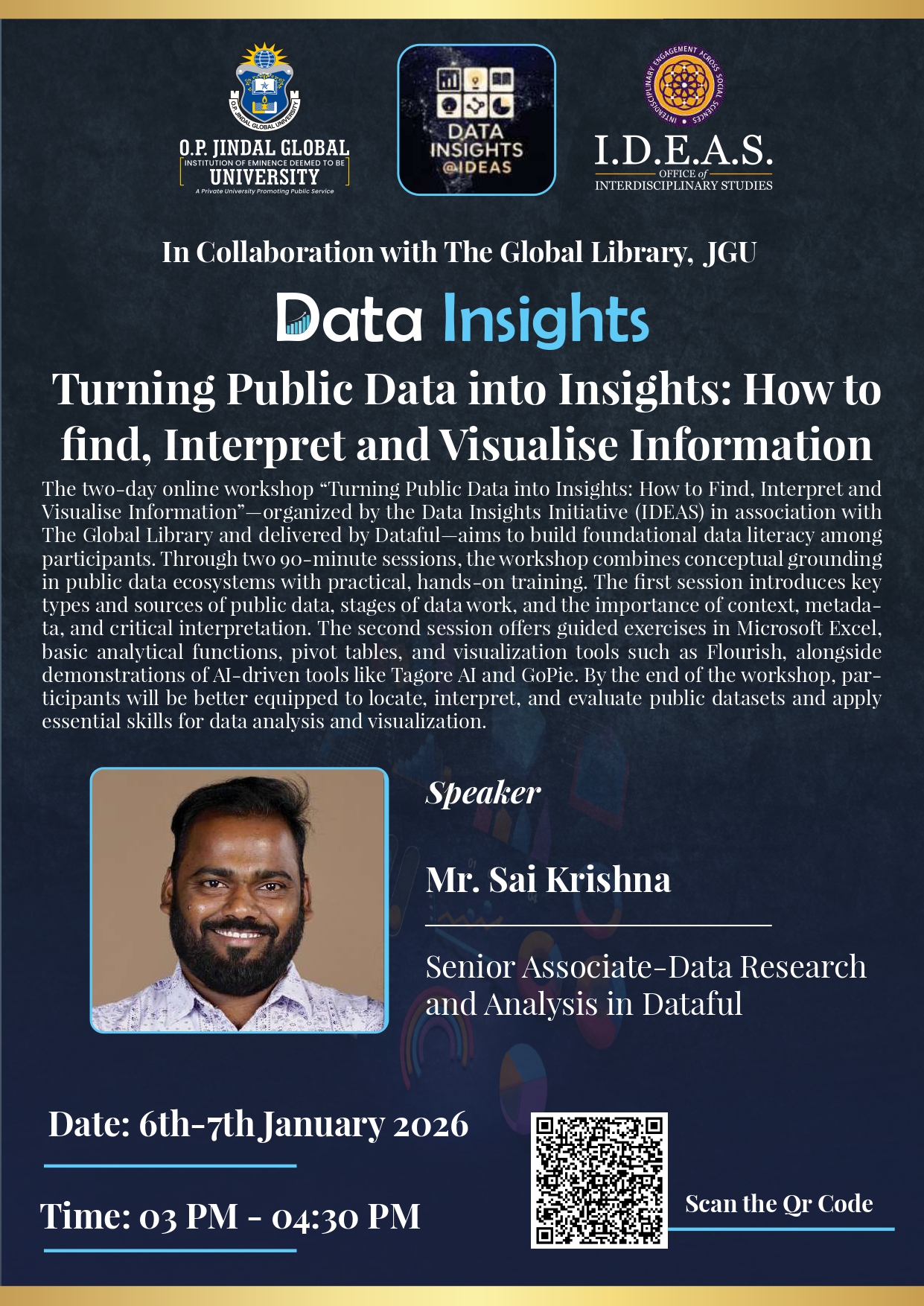 Data Insights Initiative (IDEAS), in association with The Global Library, is organising a two-day online workshop titled “Turning Public Data into Insights: How to Find, Interpret, and Visualise Information.” The workshop will be conducted by Mr. Sai Krishna, Senior Associate – Data Research and Analysis at Dataful.